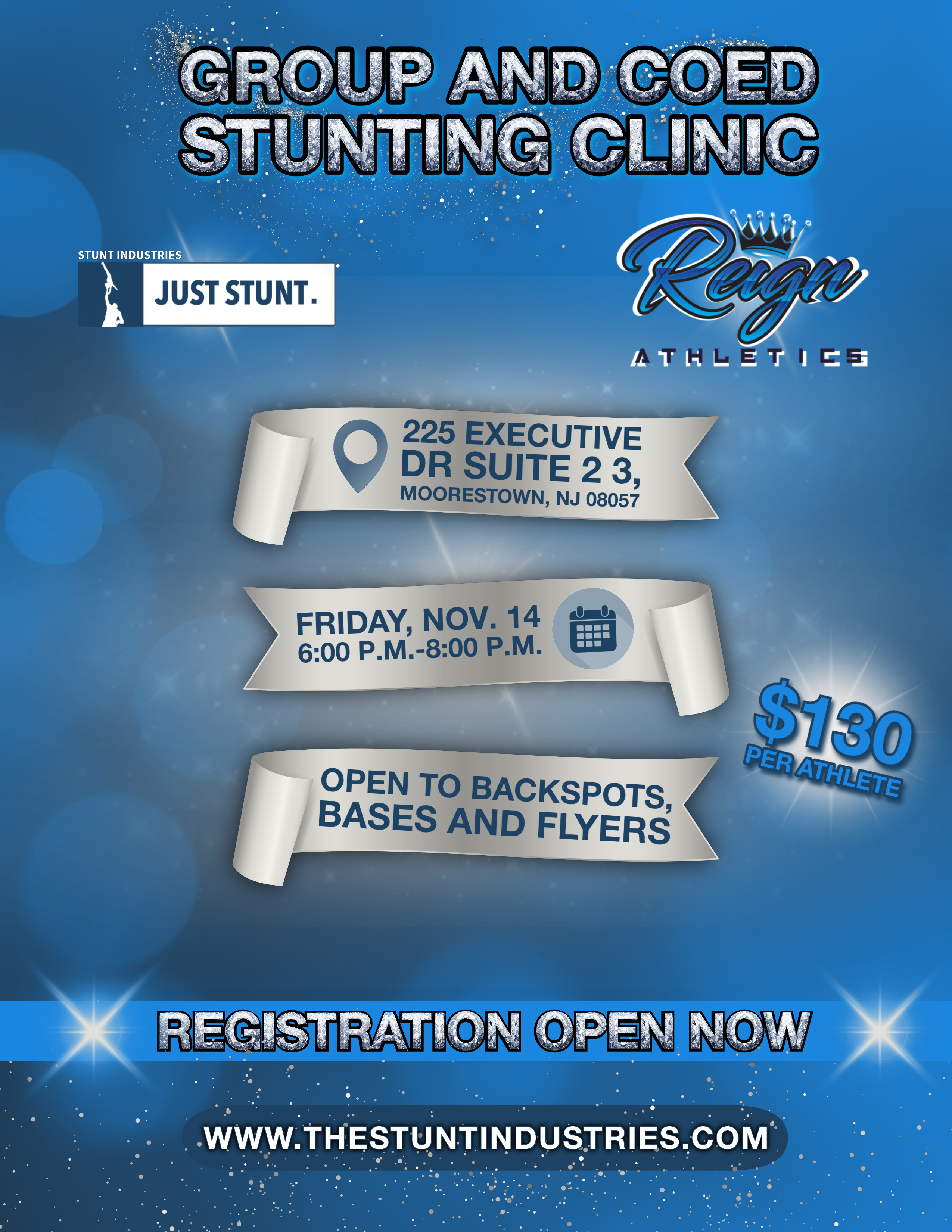 Join our exciting group and coed stunt clinics designed to enhance your skills and boost your confidence! Our experienced instructors will focus on refining your techniques, ensuring you gain the knowledge and support needed to excel. Whether you're a beginner or looking advance your skills, our clinics offer a fun and encouraging environment for all. Sign up today and take stunting to the next level!